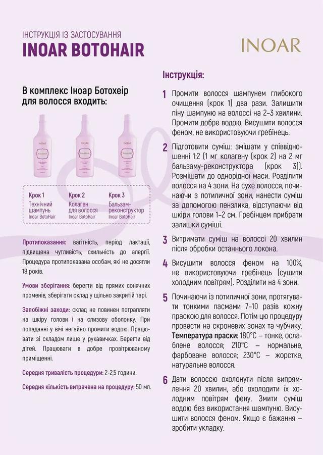 Оновлений склад комплексу дає подвійний ефект зволоження та відновлення волосся. В Іноар Ботохеір збільшився відсотковий вміст колагену, який відповідає за зміцнення кутикули, щільно закриваючи її. Також до складу додалися живильні та зволожуючі волосся по всій довжині компоненти – протеїни сої, пшениці та шовку. У Inoar BotoHair використовується гідролізована молекула кератину, що дозволяє закрити навіть найменші пошкодження у структурі волосся.